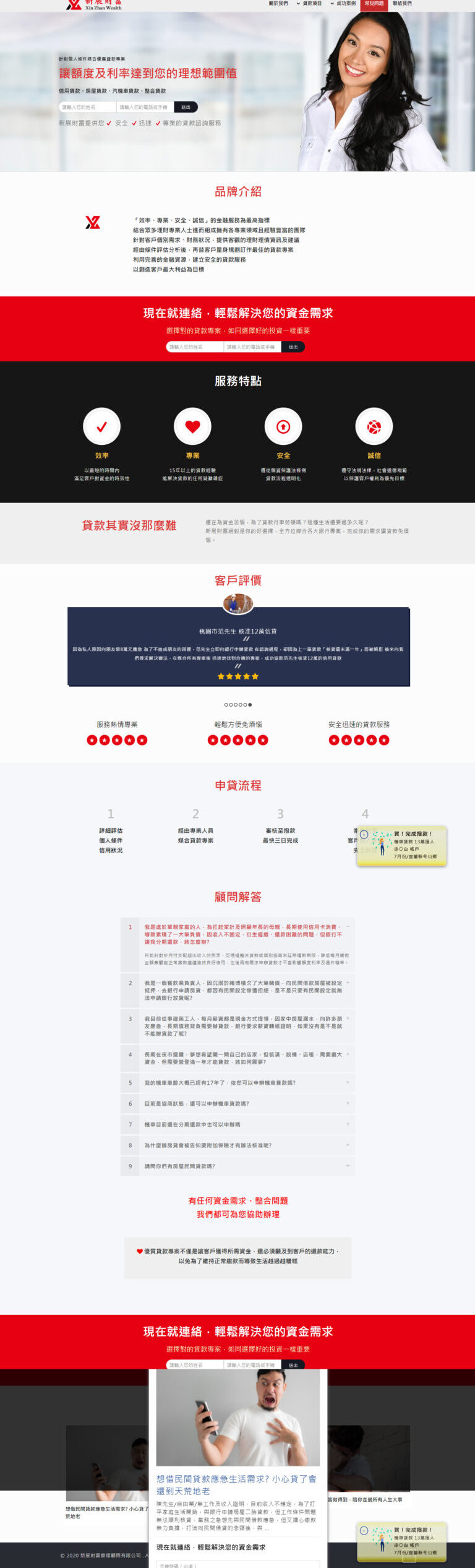一般貸款代辦,因為競爭激烈和業務需求,常需要多個網站來推廣貸款業務。新展理財也不例外,我們陸續協助業主架設了四個網站,一方設計獨特的模式化網站服務流程,能快速完成網站建置上線,協助業主後續的網路行銷布局。